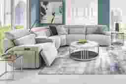 An elegant and nuanced invocation of an evening in meditation overlooking the Manhattan skyline, the Alessio dual power reclining sectional from Cindy Crawford Home has the quiet power of style and substance in its enchanting silhouette. A modern beauty, this piece boasts light gray top grain leather where the body touches on in its single attached back and seat cushion and sophisticated track arms. Featuring a console with push-up button for hidden cupholders and a reading light for late nights reading and studying, its dual power reclining includes zero gravity capabilities for the utmost in relaxing Zen. Additional hidden storage is located on the outside of the arm and USB-A and USB-C charging capabilities add the final touch of modern convenience. Upholstery: Top grain leather where the body touches and polyurethane fabric sides and backs. Leather is a durable, low maintenance product, however, general regular maintenance is necessary. To keep your leather clean, vacuum it regularly, removing any dust, and clean it with water and a mild non-detergent soap.