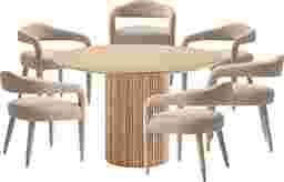 Elevate your dining experience with the Barbette natural and gold 7 Pc dining table set, a fusion of rugged aesthetics and refined functionality. Crafted for convivial gatherings, its expansive surface accommodates up to eight chairs with ease, while the raw, textured allure of the wood grain adds a touch of urban sophistication. This table beckons as a centerpiece for communal moments, where the fusion of industrial design and timeless elegance sets the stage for unforgettable meals and shared stories. Customer assembly is required.