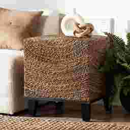 A quality of rustic ease permeates any setting adorned the stunning Benshoff brown end table. This bohemian piece is comprised of a solid wood base embellished with meticulously handwoven natural seagrass by skilled artisans. The captivating spiral design of the seagrass lends remarkable geometric allure while the square tabletop accommodates any occasion. The Benshoff utilizes tapered legs for excellent stability and support while creating a sleek silhouette. Imbued with rustic serenity, the Benshoff transforms any scene. Seagrass is a product of nature and may have variations in areas such as, but not limited to, color, pattern, grain and texture. The hair-like strands of rattan/rattan-like fiber are common due to the nature of the material. Customer assembly is required.