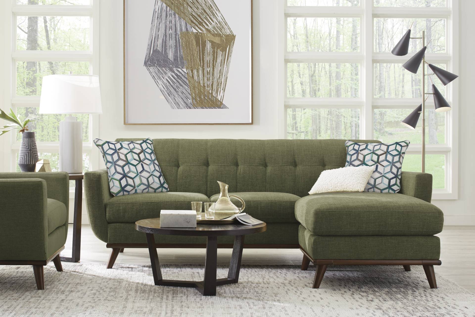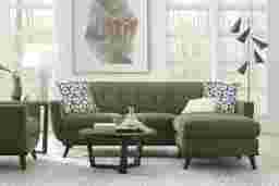 Featuring mid-century design with a bohemian touch, the East Side chaise sofa is unforgettable. Upholstered with soft chenille fabric in avocado, this piece features a distinct tailored style for a must-have retro look. Its chaise sofa design provides room to recline, while an expansive tufted back and wood base with artfully angled legs in a brown finish add to the vintage appeal. The reversible chaise can be floated to either end of the sofa's frame by simply flipping its seat cushion. Gorgeous accent pillows with a colorful geometric pattern included. Upholstery: 100% Polyester.