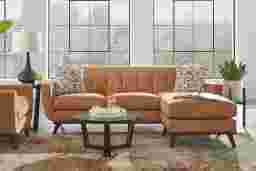 Featuring mid-century design with a bohemian touch, the East Side chaise sofa is unforgettable. Upholstered with soft chenille fabric in russet orange, this piece features a distinct tailored style for a must-have retro look. Its chaise sofa design provides room to recline, while an expansive tufted back and wood base with artfully angled legs in a brown finish add to the vintage appeal. The reversible chaise can be floated to either end of the sofa's frame by simply flipping its seat cushion. Gorgeous accent pillows with a colorful geometric pattern included. Upholstery: 100% Polyester