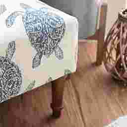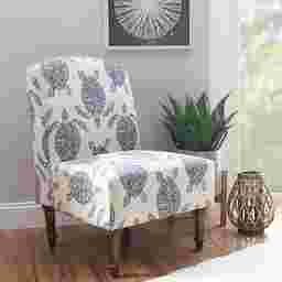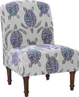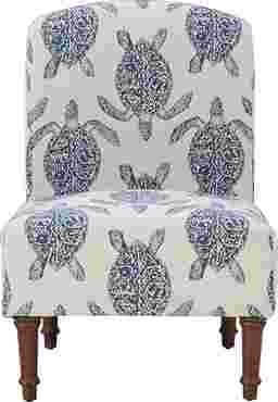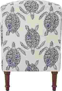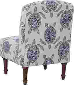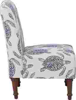 Transform your reading nook or living room with the Eastchill cozy accent chair, perfect for a modern coastal theme. The whimsical turtle print in indigo and cream hues adorns a snug polyester and cotton blend over plush cushions. Supported by a sturdy wooden frame with turned wood legs in a gray wash stain, this chair effortlessly blends modernity with a traditional touch. Its armless design ensures an easy fit in corners and tight spaces, providing both style and comfort to any setting. Customer assembly required.
