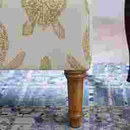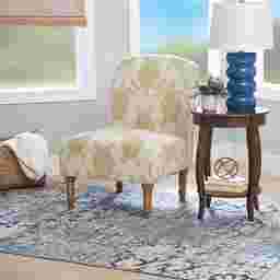 Transform your reading nook or living room with the Eastchill cozy accent chair, perfect for a modern coastal theme. The whimsical turtle print in indigo and cream hues adorns a snug polyester and cotton blend over plush cushions. Supported by a sturdy wooden frame with turned wood legs in a gray wash stain, this chair effortlessly blends modernity with a traditional touch. Its armless design ensures an easy fit in corners and tight spaces, providing both style and comfort to any setting. Customer assembly required.