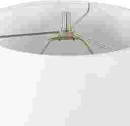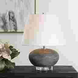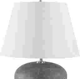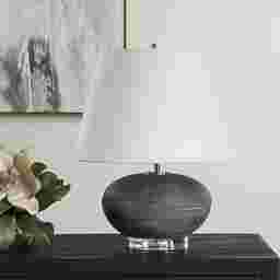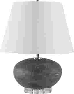 Featuring a ceramic base finished in a distressed charcoal glaze with unique stone-like texture and bronze highlights. The Eliza Hollow Charcoal Lamp is elegantly accented with a thick crystal foot and plated nickel hardware. The tapered round hardback shade is covered in a casual white linen fabric. Partial assembly may be required.