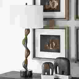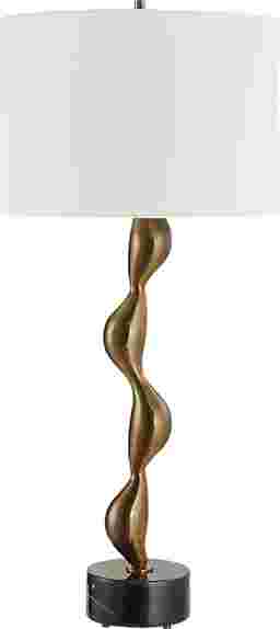 The Freer Cove Bronze Lamp demands attention with its playful and unique profile. The design is crafted from cast iron, finished in a plated warm bronze and displayed on a thick black marble foot, giving this table lamp a rich elegance. A round hardback drum shade made with a crisp white linen fabric completes the piece. Partial assembly may be required.