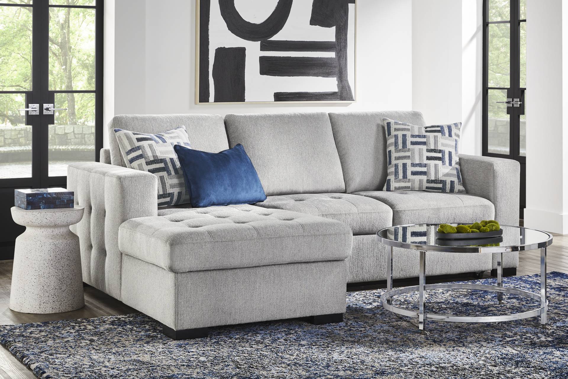 The confident, classy personality of the Geneva sectional takes grounded and crowd-pleasing design to stylish new heights. Cutting a unique modern silhouette in textured gray fabric, this sofa features big, bold track arms with tufting on the sides. The seats feature tufting to match, with attached cushions that stay comfortably in place when it's time for the pop-up sleeper to make its debut for the night. Hidden in the end chaise is a convenient storage space perfect for stowing blankets. Included with the piece, a coordinating set of accent pillows can be rearranged for maximum comfort. Upholstery: 87% Polyester, 13% Polypropylene.