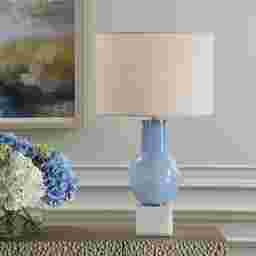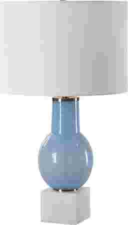 The Justine Cave Blue Lamp features a sky-blue seeded glass body atop a sturdy white marble foot with brushed nickel-plated accents this lamp adds a touch of sophistication to any space. The round hardback drum shade is a crisp white linen fabric. Partial assembly may be required.