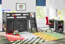 The ultimate collection for your color obsession is finally here with the Modern Colors twin low loft bed. Constructed from poplar solids in iron ore finish, each piece balances ultra-sleek craftsmanship with easygoing comfort. Featuring a twin bed that sits lower to the ground than a traditional loft, this piece features a ladder that affixes to the side of the frame for three easy steps up and three easy steps down. The coordinating loft chest has three drawers crafted with front French dovetail joints and ball bearing, side mounted glides. Soar through study time with the coordinating caster desk that can be wheeled out and around at a moment's notice. The desk even has a couple cubbies that are perfect for textbooks or homework supplies. A matching 37-inch bookcase can shelve books, comics, magazines, decor and more. The hardware is finished in brushed nickel but brushed gold knobs and pulls are also included with purchase. Mattress and foundation (if required) sold separately. This product requires a bunkie board (sold separately).