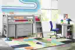 The ultimate collection for your color obsession is finally here with the Modern Colors full low loft bed. Constructed from poplar solids in light gray finish, each piece balances ultra-sleek craftsmanship with easygoing comfort. Featuring a full bed that sits lower to the ground than a traditional loft, this piece features a ladder that affixes to the side of the frame for three easy steps up and three easy steps down. The coordinating loft chest has three drawers crafted with front French dovetail joints and ball bearing, side mounted glides. Soar through study time with the coordinating caster desk that can be wheeled out and around at a moment's notice. The desk even has a couple cubbies that are perfect for textbooks or homework supplies. A matching 52-inch bookcase can shelve books, comics, magazines, decor and more. The hardware is finished in brushed nickel but brushed gold knobs and pulls are also included with purchase. Mattress and foundation (if required) sold separately. This product requires a bunkie board (sold separately).