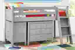 The ultimate collection for your color obsession is finally here with the Modern Colors twin low loft bed. Constructed from poplar solids in light gray finish, each piece balances ultra-sleek craftsmanship with easygoing comfort. Featuring a twin bed that sits lower to the ground than a traditional loft, this piece features a ladder that affixes to the side of the frame for three easy steps up and three easy steps down. Two coordinating loft chests have three drawers crafted with front French dovetail joints and ball bearing, side mounted glides. The hardware is finished in brushed nickel but brushed gold knobs and pulls are also included with purchase. Mattress and foundation (if required) sold separately. This product requires a bunkie board (sold separately).