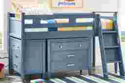 The ultimate collection for your color obsession is finally here with the Modern Colors twin low loft bed. Constructed from poplar solids in slate blue finish, each piece balances ultra-sleek craftsmanship with easygoing comfort. Featuring a twin bed that sits lower to the ground than a traditional loft, this piece features a ladder that affixes to the side of the frame for three easy steps up and three easy steps down. Two coordinating loft chests have three drawers crafted with front French dovetail joints and ball bearing, side mounted glides. The hardware is finished in brushed nickel but brushed gold knobs and pulls are also included with purchase. Mattress and foundation (if required) sold separately. This product requires a bunkie board (sold separately).