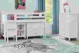 The ultimate collection for your color obsession is finally here with the Modern Colors full low loft bed. Constructed from poplar solids in white finish, each piece balances ultra-sleek craftsmanship with easygoing comfort. Featuring a full bed that sits lower to the ground than a traditional loft, this piece features a ladder that affixes to the side of the frame for three easy steps up and three easy steps down. The coordinating loft chest has three drawers crafted with front French dovetail joints and ball bearing, side mounted glides. Soar through study time with the coordinating caster desk that can be wheeled out and around at a moment's notice. The desk even has a couple cubbies that are perfect for textbooks or homework supplies. A matching 52-inch bookcase can shelve books, comics, magazines, decor and more. The hardware is finished in brushed nickel but brushed gold knobs and pulls are also included with purchase. Mattress and foundation (if required) sold separately. This product requires a bunkie board (sold separately).