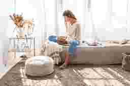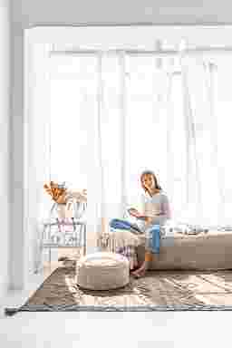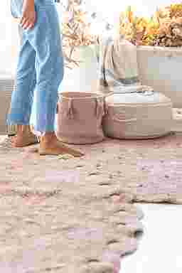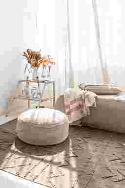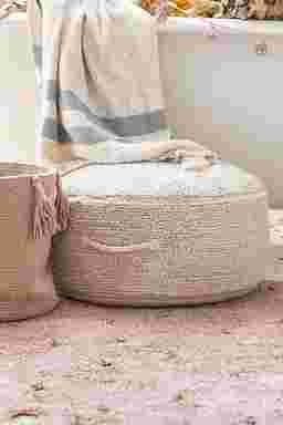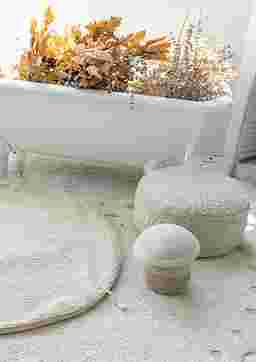 This unique artisan pouf is thoughtfully designed by Lorena Canals. Every step of the process prioritizes minimizing waste and creating long-lasting, eco-friendly pieces. The round pouf comes in a warm chestnut color and features a handmade braided handle in a matching tone. Its top and sides are covered in soft rug pile, while the bottom is crafted from durable cotton canvas and finished with a zipper. Inside, a removable filler filled with polystyrene pearls adds comfort and practicality.