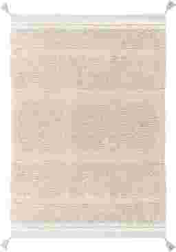 This unique artisan rug is 100% machine washable and sustainably handcrafted in our own factory using natural fibers. The canvas base adds texture through rows of varying pile heights. The rug comes in a soft rose color, accented with contrasting border lines in nude and natural and a delicate embroidered detail over the bare canvas. Small tassels at each corner complete the handcrafted look with a charming finish.