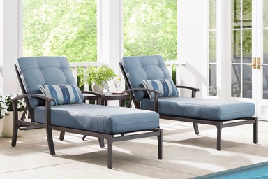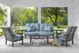 Make your backyard an inviting destination with the Lake Breeze seating set. This cozy outdoor collection features slat back styling and is made with an aluminum frame in a rust resistant all-weather powder coat finish using a hand applied aged bronze finished UV protected top coat. Blueberry-colored cushions resist fading and are mold and mildew resistant, creating long lasting and comfortable outdoor seating. Designer style accent pillows and button tufting details on the back cushions add decorative flair. Select colors available in Sunbrella outdoor fabric.