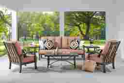 Make your backyard an inviting destination with the Lake Breeze seating set. This cozy outdoor collection features slat back styling and is made with an aluminum frame in a rust resistant all-weather powder coat finish using a hand applied aged bronze finished UV protected top coat. Terracotta-colored Sunbrella outdoor fabric cushions resist fading and are mold and mildew resistant, creating long lasting and comfortable outdoor seating. Designer style accent pillows and button tufting details on the back cushions add decorative flair. 100% Sunbrella fabric. To clean Sunbrella fabric cushions remove dirt and spray on cleaning solution (water and mild soap), then use a soft bristle brush or sponge. Allow cleaning solution to soak into fabric and rinse thoroughly until soap residue is removed. Air dry. Pillows not as shown; includes different set of accent pillows.