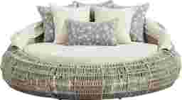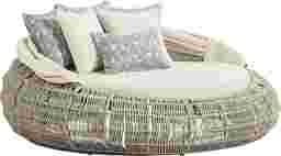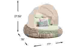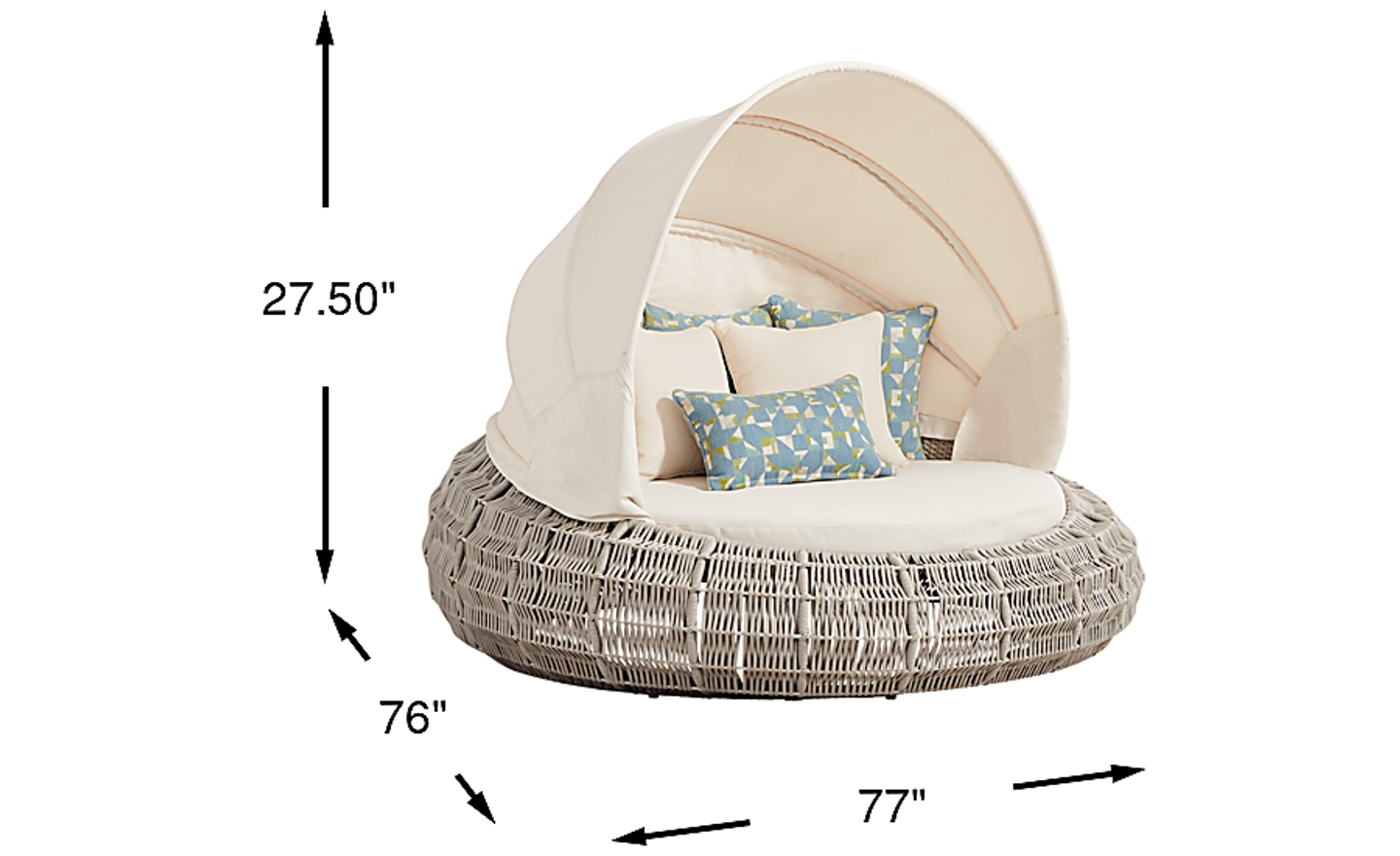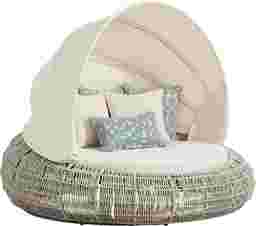 Moments spent stretched out in a dreamlike serenity are moments to cherish on the Malibu daybed, its ultra cozy profile balanced against a sophisticated look made to turn heads and get everyone buzzing. A round frame of rust-resistant aluminum is wrapped in marine grade rope in gray, UV-resistant for lasting color and enjoyment. The collapsible sunshade in beige can be tidied away and secured shut by a simple self-fastening closure when not in use. To add to the inviting comfort of the round beige cushion, six pillows are included in patterned and matching outdoor fabrics to create exactly the support and softness you want for those dreamy afternoon naps on the patio.