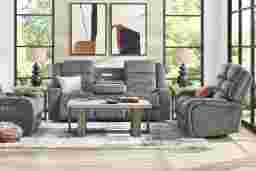 A calming hush settles, the room begins to feel less like a place and more like a quiet, comfortable pause as the McKinley collection's soft textures and clever luxury invite effortless relaxation. This classically styled living room is wrapped in soft graphite gray microfiber and showcases generously deep tufting for a cloudlike silhouette. Contrasting top-stitched seams add tailored definition throughout, while the seats and back feature highly decorative double stitching for a refined touch. The additional delight of power reclining on the glider recliner includes a power adjustable footrest and USB charging ports set into the control panel. Hidden cupholders tucked into the arms offer a sleek solution for keeping drinks within reach. The sofa includes a center fold-down table with cupholders, a storage pocket and wireless charging. Upholstery: 100% Polyester. Cleaning Instructions: Use water based cleaning agents or foam. Tables and lamps not as shown in room image. Accent pillows not included.