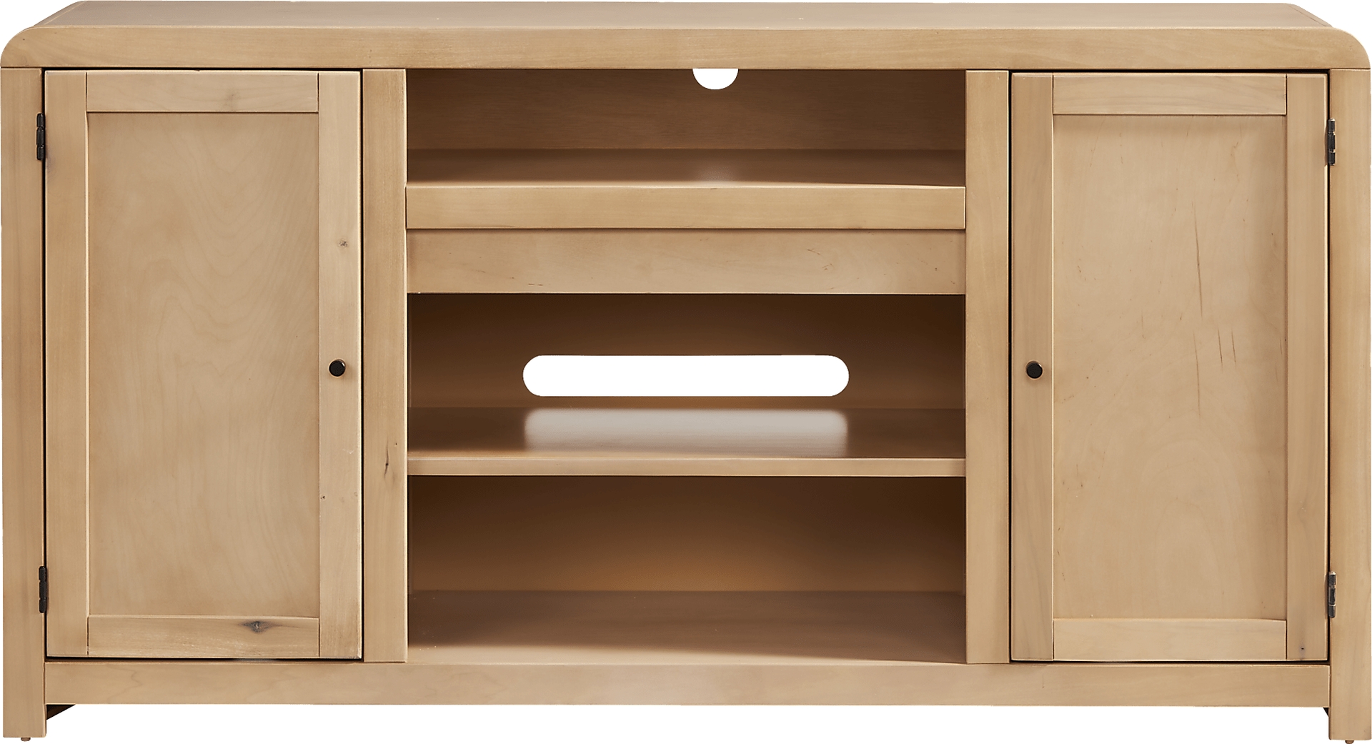 Symmetrical and timeless with a charming perspective of cozy warmth and poise, the Montavilla console is designed to enhance both style and comfort in your home. Crafted from poplar wood, this contemporary piece boasts a light brown finish that effortlessly complements any style. Showcasing two doors that provide easy access to storage and a top center cubby that offers the perfect space for media devices or display items, this console is built to accommodate televisions up to 65 inches. Adjustable shelves ensure customizable organization, while wire management holes keep cords neatly concealed.