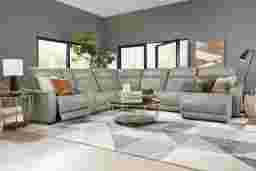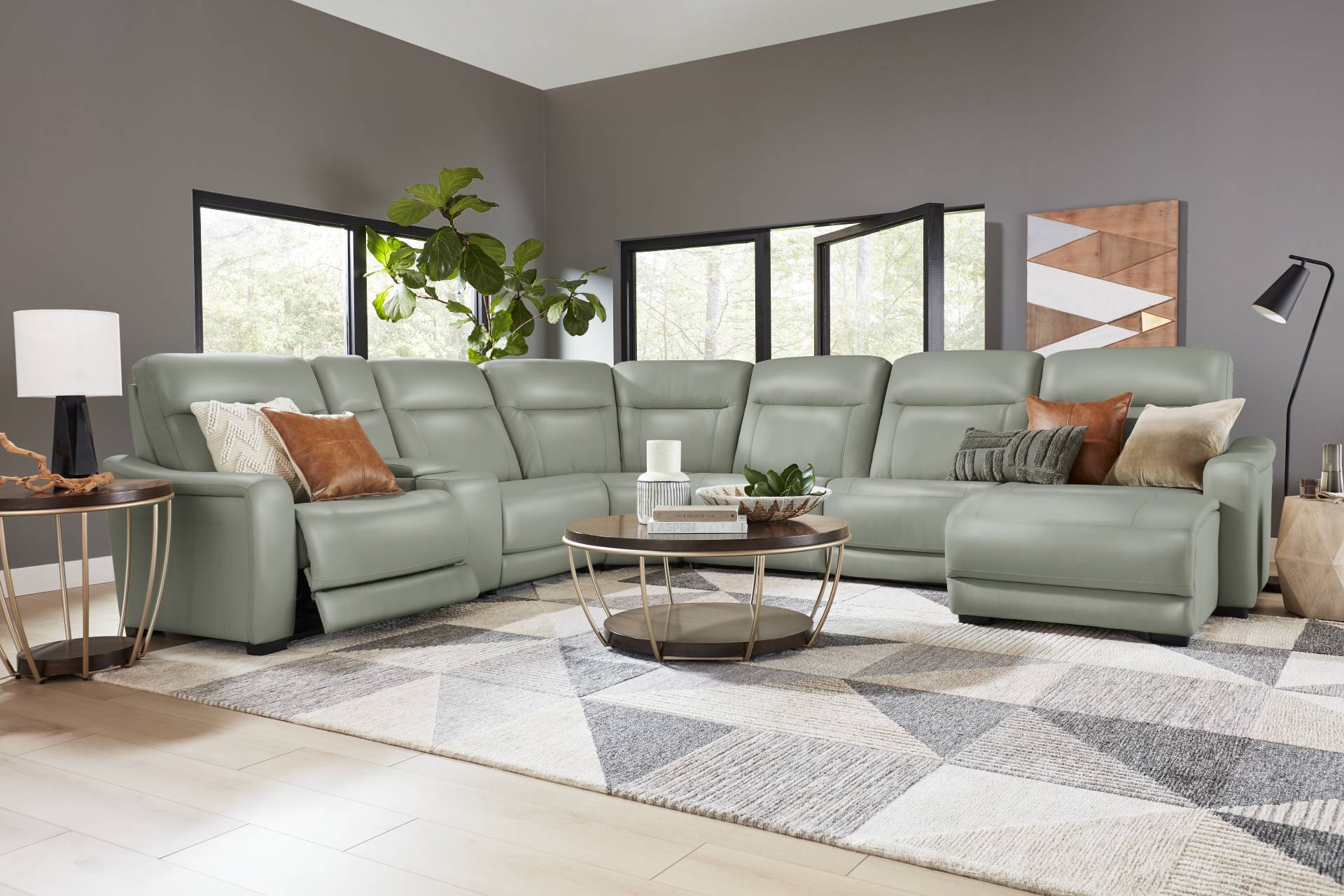 The sleek design, understated sophistication and casual profile of the Drew & Jonathan Newport sectional presents a warm, inviting feeling the whole family can enjoy. Modern in style, this sectional is upholstered in a soft, supple mint-colored top grain leather where the body touches with stylish double top-stitched seams for a luxurious look. Curved, padded arms, wide seats and an elongated footrest in the chaise provide ample space for exceptional comfort. The console adds more space as its hidden cupholders and storage compartment hold your relaxation essentials perfectly, as well as additional charging ports for devices. Dual power reclining functions provide the finishing touch, allowing adjustments in the head and footrest with a patented zero gravity mechanism for the ultimate lounging experience. Upholstery: Top grain leather where the body touches. Polyurethane sides and back.