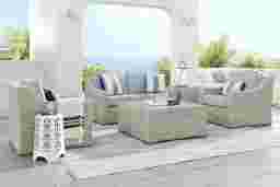 Boasting a breezy French Provencal style, the Patmos outdoor seating set has a classic and casual aesthetic. Crafted with all-weather woven wicker in a gray finish with generously sized seats, gracefully sloping arms and incredibly durable cushions for the perfect outdoor seating pieces. A coordinating cocktail table is a great spot for drinks, hors d'oeuvres and more. Steel colored outdoor performance cushions, upholstered in InsideOut fabric, are easy to care for and offer a fabulous look. Toss pillows add a decorative finishing touch on the loveseat.