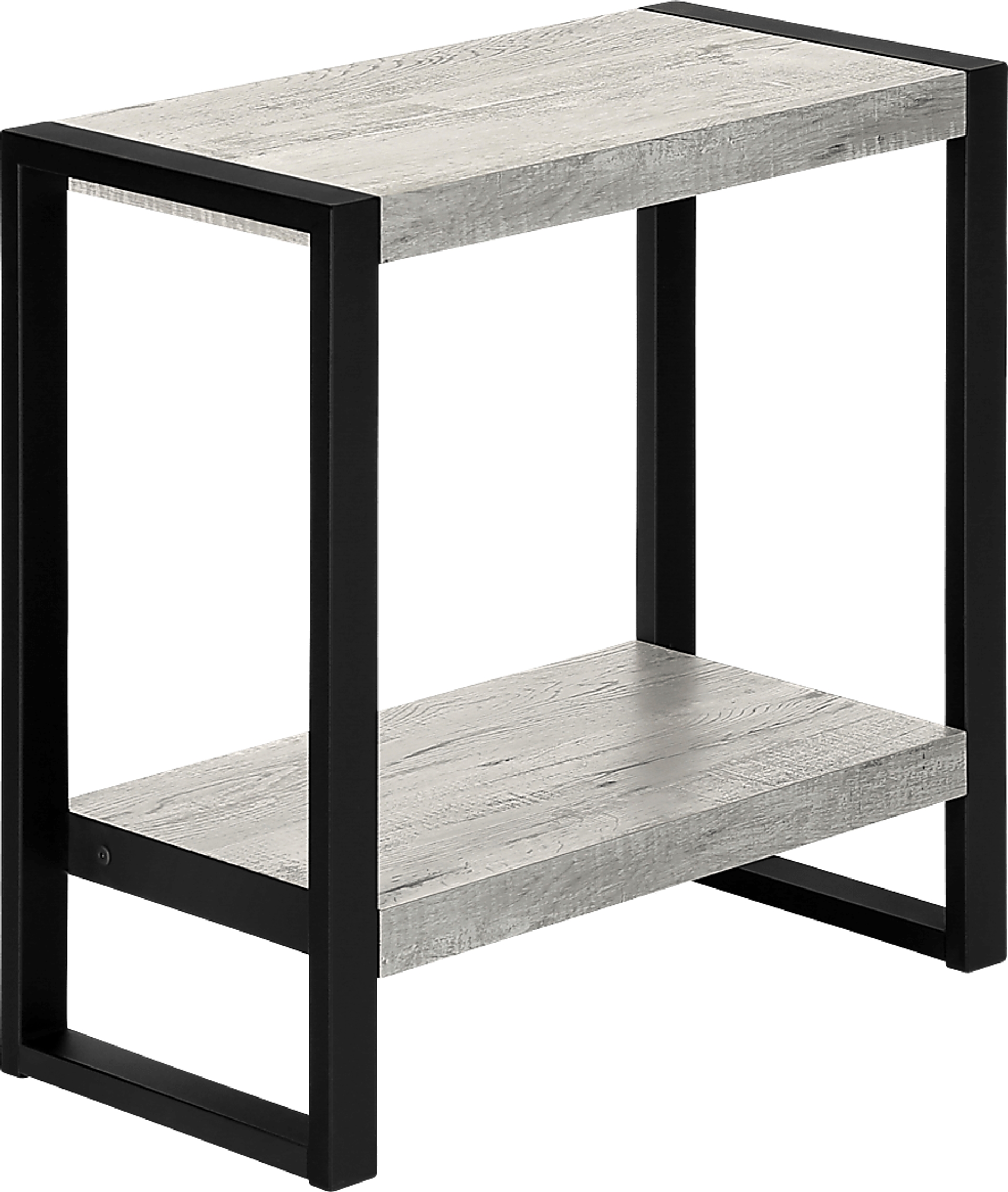 Industrial-farmhouse style combines modern metal with a rustic wood finish to create a warm, inviting look. This two-tier rectangular Willark side table embodies that popular style. The tabletop and bottom shelf are finished in a gray reclaimed-wood look with naturalistic color variations and a subtle wood-grain texture. Robust metal legs in a black finish provide stability and a striking visual contrast. Finished on all sides, this side table can be positioned in any direction to fit both narrow and wide spaces in a living room or bedroom. Customer assembly is required.
